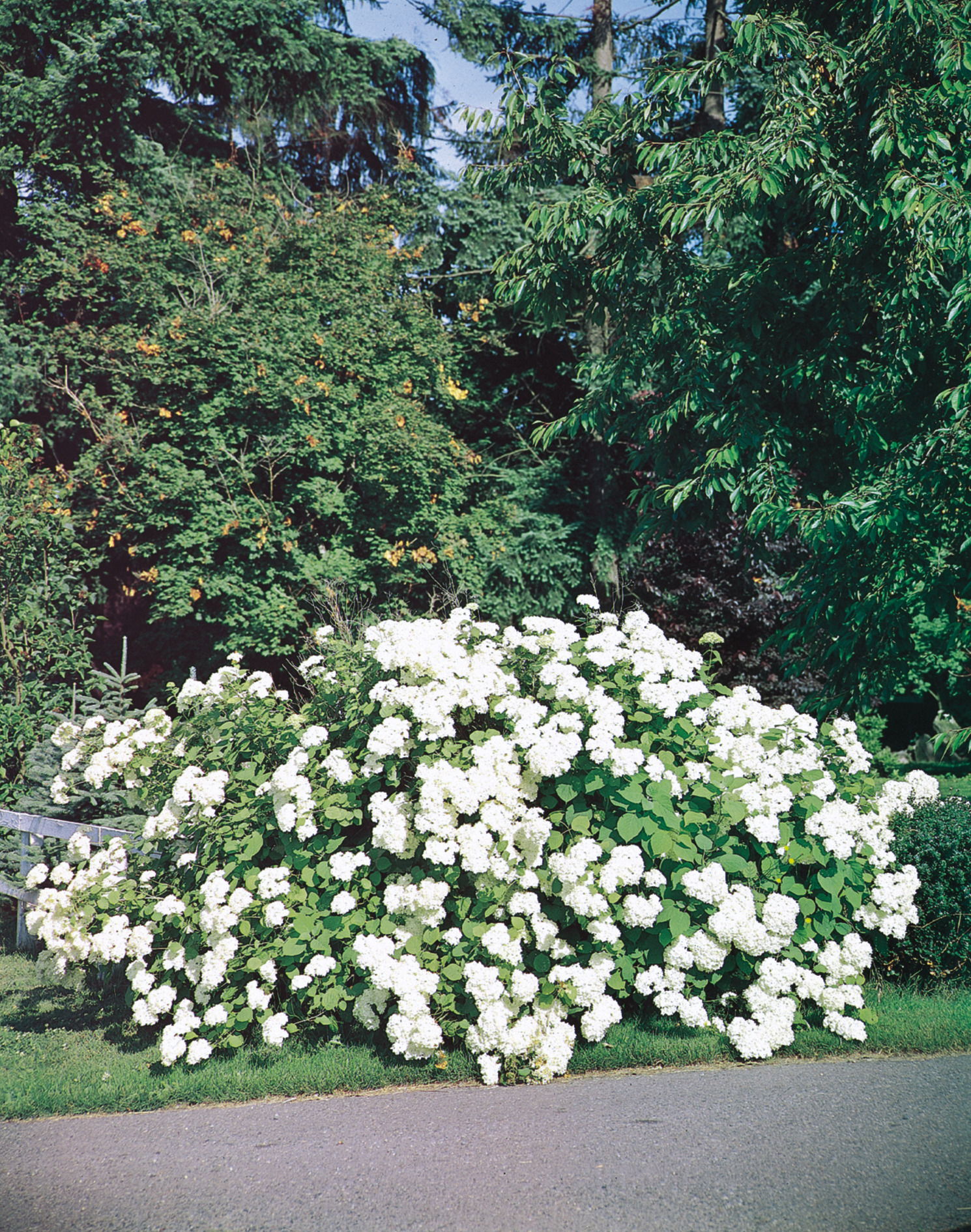 Large clusters of white flowers bloom in summer. Large, rich green leaves. Prefers moist soil and partial shade. Deciduous.