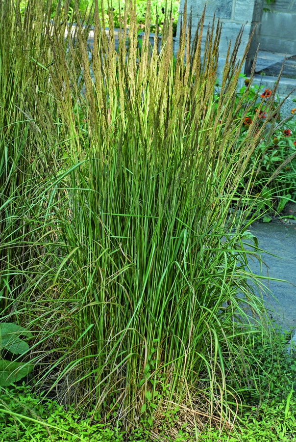 Graceful, vertical clump forming grass. Stiff foliage has white centers and forms a narrow clump. Green to pink flower plumes in summer and fall.