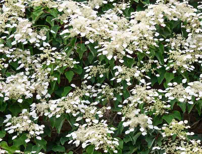 Vigorous, climbing vine, clings to surfaces by aerial roots. Magnificent lace cap form white blooms. Deciduous.