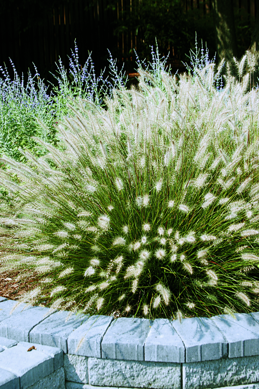 Fine-textured, dwarf fountain grass makes a great accent as well as mass planting. Bottlebrush-like flowers start green and age to a shimmery wheat color. Great fall color.