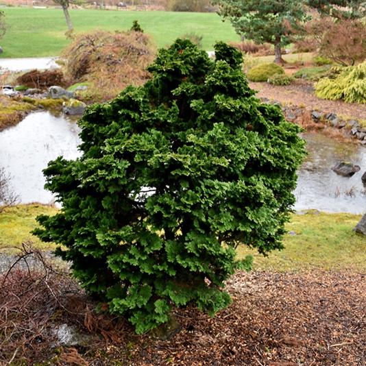 A slow-growing, highly prized evergreen shrub featuring dense, dark green foliage with twisted, shell-like fans.
