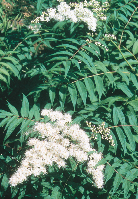 Upright plant with large plumes of creamy white flowers in June and fern-like foliage. Spreads quickly. Great for soil retention.