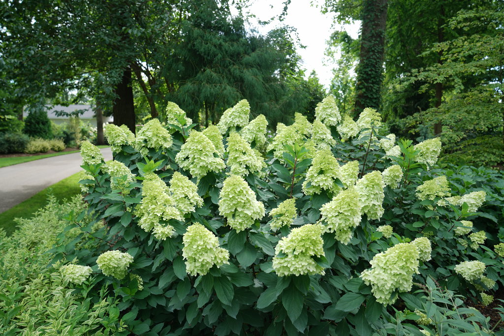 A compact, improved panicle hydrangea with stronger stems, darker foliage, and earlier blooming than the original Limelight.