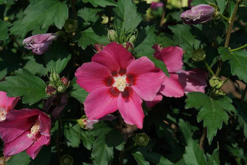 A vigorous shrub in the Paraplu™ series, famous for its giant, deep pinkish-red flowers, considered one of the closest to “true red” in Sharon roses.