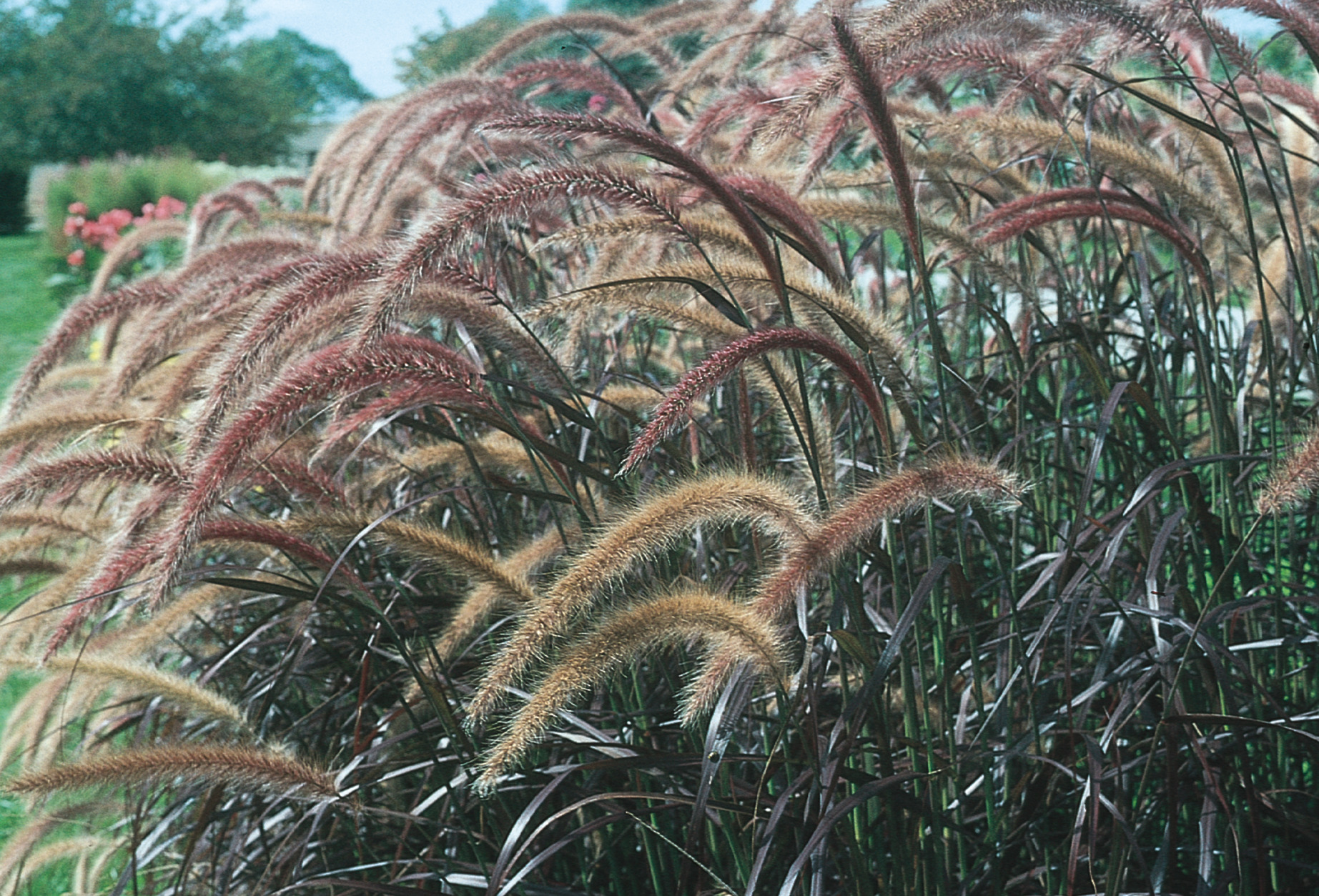 Gorgeous reddish-purple color on tidy, arching clumps of foliage. Fluffy, bottlebrush-like flowers are tan with burgundy tinting. Great as a specimen or container plant. Cold tender.