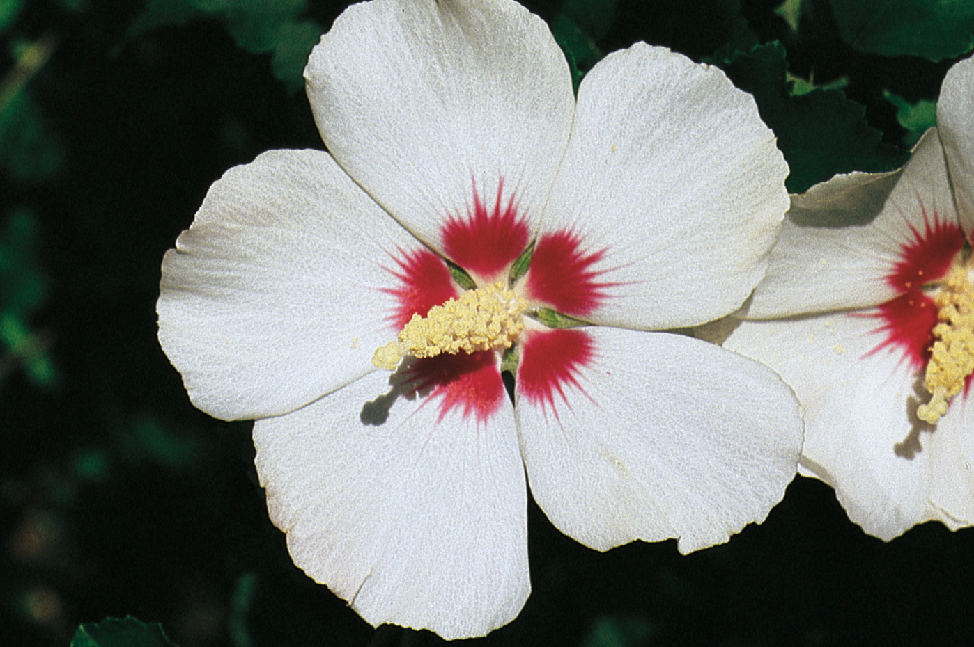 Upright, multi-stemmed ornamental shrub with handsome, dark green leaves. Single, pure white flowers with a scarlet red center.
