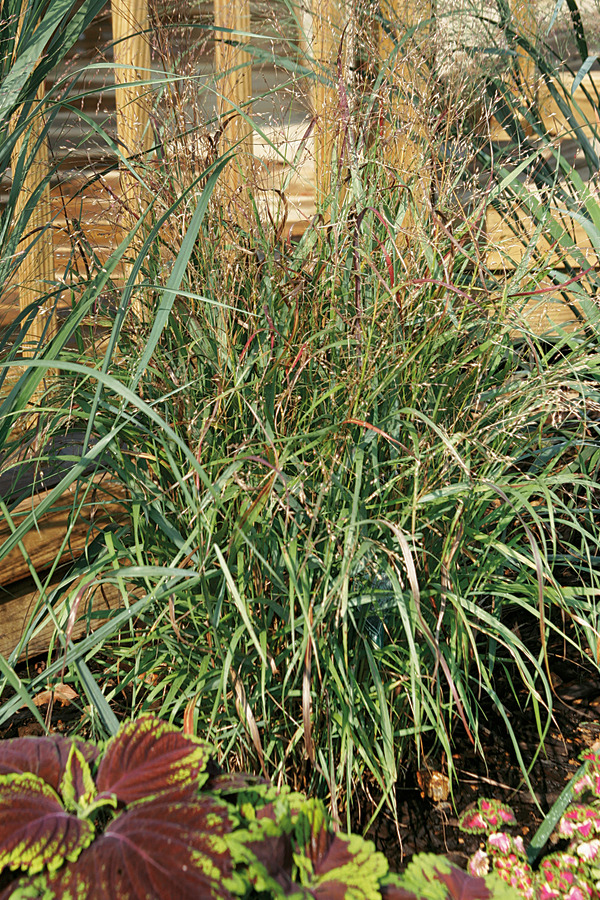 Striking foliage emerges green with red tips and turns to burgundy, tan and gold in fall. Airy reddish-pink flowers in late summer. Great in masses or containers.