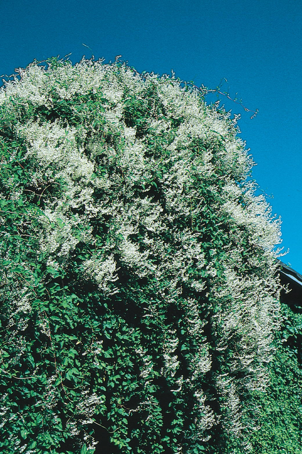 Showy, fast-growing vine with small, creamy white flowers in frothy clusters and heart shaped foliage. Perfect for arbor, trellis or fence. Deciduous.