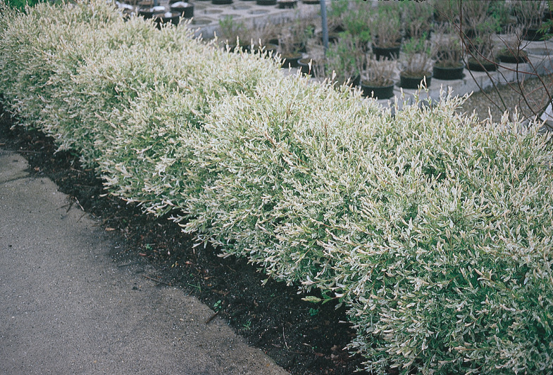 Graceful shrub bearing arching, salmon-pink stems with light green leaves splashed with pink and white. Provides all-season interest.